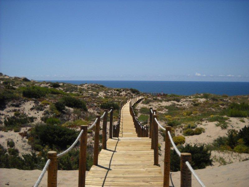 The road is rather sinuous but very pretty and The view from the road is splendid. You go down to Malveira da Serra - a small village on the southern slope of the mountain - from there you go to: Guincho, Cascais. The beach of Guincho is vast and sandy and rather windy, so a must for surfers and very popular in the summer. Then one continues on the seafront. At the entrance to Cascais one passes the "Mouth of Hell", an excavation in the cliffs where the sea comes in making an astonishing noise.